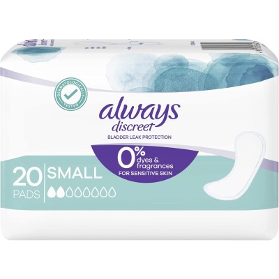 Always Discreet Incontinence Pads for Sensitive Skin, 0% Dyes & Fragrances, Small, 20 Pack